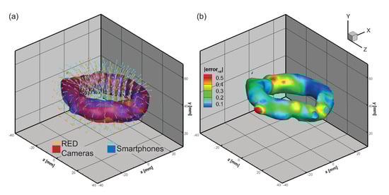 In Figure 10a, we present an overlay of an isovorticity surface, = 210 s−1, and velocity vectors obtained with both systems at the same instant. Visually, the isovorticity surfaces and velocity vectors are comparable and describe the same qualitative features of the vortex ring. Nevertheless, one has to keep in mind that the spatial resolution of the velocity field produced by the smartphones is approximately 1/4 of the spatial resolution of the RED cameras. We further perform a node-by-node comparison and obtain an error estimation of the velocity components. Since the resolution of the two systems is different, the RED camera results are downscaled by linear interpolation to match the same grid size as the smartphone system case (i.e., from the original 1.03 × 1.03 × 1.03 mm3 mesh to a 1.64 × 1.64 × 1.64 mm3 per node). This interpolation allows us to obtain the relative error vector of the velocity at every node. The error vector is normalized by the maximum magnitude of velocity (herein, 1.8 m/s). Figure 10b presents an isovorticity surface of 210 s−1 colored by the relative error, this way we can detect the regions where the error is higher. One has to keep in mind that regions close to the vortex core have the greatest velocity gradient. The values presented in the plot represent an upper bound of our error.