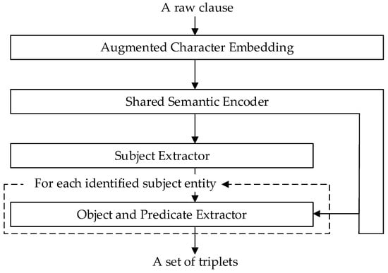 Algorithm 1 presents the pseudocode for decoding the tagging results from the subject extractor and the object and predicate extractor. Lines 1–3 represent the initialization process for each input clause S expressed in natural language. Lines 4–12 describe the algorithm for deriving candidate subject entities from the tagging results of the subject extractor. Then, Lines 13–24 describe the algorithm for acquiring all candidate triplets from the tagging results of the object and predicate extractor. In detail, for a sentence with k subject entities, the entire task is finally deconstructed into two tasks for subject-entity tagging and tasks for object-entity and predicate tagging. By means of this inference algorithm, the triplets can be directly identified from the start/end positions and tags of the entities, thus helping to accelerate the inference process and reduce the demand for computing resources. Moreover, nonrelated pairs can be excluded through the judicious recognition of the subject entities, and the overlapping relation problem can be naturally resolved.