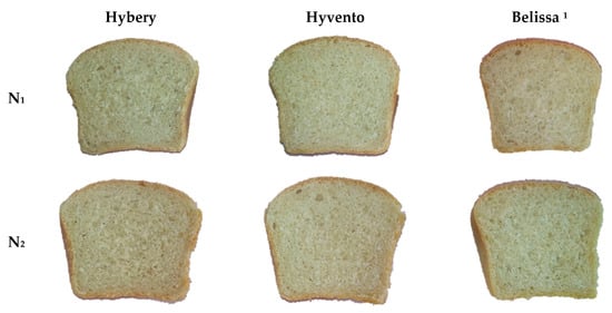 The assessed quality indicators for bread were characterised by high stability and the values of the coefficient of variation (CV) were the lowest for bread yield and crumb moisture content. The use of the N1 dose increased the stability of baking loss while the N2 dose increased the stability of bread volume and the Dallmann porosity index of crumb. Photographs of the bread crumb of selected cultivars are shown in Figure 1.