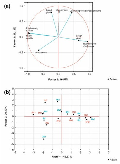Figure 3a shows the projection of variables on the factor plane. The first principal component transfers the information contained in positively correlated variables, degree of softening, dough yield and negatively correlated values, dough stability, quality number and grain vitreousness (Table 6). The variable quality number is positively correlated with dough stability (r = 0.96, p < 0.05), while the variable dough yield is positively correlated with the variable dough degree of softening (r = 0.58, p < 0.05), which indicates the position of the vectors in close proximity. The second principal component comprises mostly of positively correlated variables, Dallmann porosity index of crumb, gluten index and bread yield. The variables of bread yield and Dallmann porosity index of crumb are positively correlated with the gluten index variable (r = 0.48 and r = 0.49, p < 0.05). The vectors of the degree of softening, dough quality number and grain vitreousness variables are longer and located closer to the circle, which indicates that these variables contribute the most information.