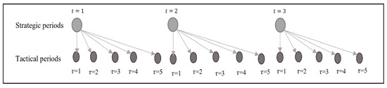 - The problem is studied in a multi-period framework. The total planning horizon is classified into two types of periods as the strategic periods and tactical periods. Each strategic period is composed of several tactical periods with different kinds of decisions to be made.