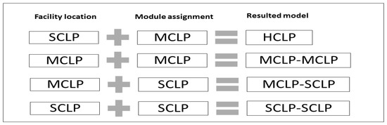 There are other potential ways to combine SCLP and MCLP to shape the hybrid model. In the developed model of HCLP, SCLP is used to locate the facilities as strategic decisions, and MCLP is used to find the assignment of modules and demand allocation as tactical decisions. In the same way, MCLP-MCLP may refer to the case that both strategic and tactical decisions are determined using MCLP, SCLP-SCLP refers to the case where both strategic and tactical decisions are determined using SCLP, and finally, MCLP-SCLP refers to the model that strategic decisions are taken using MCLP and tactical decisions by using SCLP. These four models are comparable, because the solution variables are the same in all four models (except the number of located facilities that can be obtained from SCLP). Besides the same solution, the goal of covering problems, which is to cover more demand points, can be extracted from all four models as the coverage percentage. In this section, the mathematical model for each of these variants is developed, and in Section 7, the numerical examples are conducted to evaluate these models in terms of the coverage they provide and efficiency (elapsed time). Figure 2 shows these different possible hybridization problem structures.