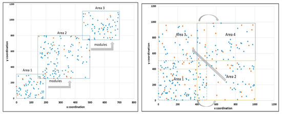 In this section, some test problems were generated randomly with different sizes to examine the performance of the developed HCLP model. For this purpose, the test problems were designed in two main directions. In the first experiment, it is supposed that there are three regions affected by disasters with two kinds of high and low demand scenarios in three strategic periods. In the second experiment, there are four regions affected by the disasters with high and low demand scenarios in four strategic periods. A schematic illustration of three regions and four regions test problems together with the located facilities, and the module movement flow is depicted in Figure 5 for the case with 250 demand points. In each kind of experiment, the dimensions of the test problems are augmented gradually. Table 3 and Table 4 contain the results of the test problems. The problems are solved using Generic Algebraic Modelling System (GAMS) (CPLEX solver) software (24.1.2) on a PC with a 3.4-GHz Core i7-6700 CPU and 8 GB of RAM running Windows 10 (64 bit). It must be noted that all parameters of the test problems are designed in a way that there would be no redundant constraints. The results for all test problems approve that problems of low scenarios result in less objective values, but a higher percentage of demands can be covered in the low scenario problems compared to the high demand scenario problems. By increasing the size of the problems, the elapsed time also increases for both kinds of problems in Table 3 and Table 4. For the problem of the size 250 points of three regions, we conducted some sensitivity analyses. As mentioned, the first two problems of low and high demands are the problems that all the constraints are active. By increasing the capacity of facilities, in second and third problems, the constraints of the facilities capacity become redundant, so that changing these parameters has no more effect on the solutions. In the last problem, the capacities of the facilities are set to be active, and the capacities of the modules are increased such that these changes yield to increase in objective value and coverage percentage, though the difference is not much significant. Comparing the results of the coverage percentage for two tables, it becomes clear that, for large-scale problems, the problems of four regions could provide significantly better coverage. The reason for the difference in parameter values in two kinds of problems (Table 3 and Table 4) is to avoid having redundant constraints. GAMS was able to solve the problems of 250 demand points. However, this size of the problem is not regarded as a small size, because considering the modules and sizes and two kinds of time periods, the real size of the problems are in the category of large-size problems.