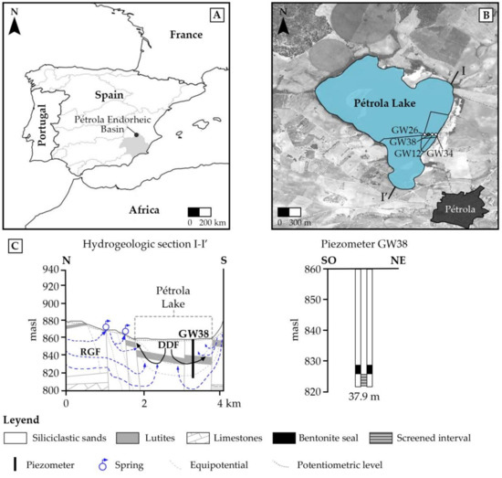 (A) Location of the Pétrola endorheic basin in southeast Spain. (B) Location of piezometers installed in Pétrola Lake. The piezometer which withdraws regional groundwater was selected for groundwater sampling. (C) Simplified hydrogeological section showing the main groundwater flow components and the allocation of the piezometer GW38. In the same caption is shown the building characteristics of the piezometer GW38 with an indication of the screening zone and sealed interval. masl: meters above sea level. DDF: density-driven flow. RGF: regional groundwater flow.