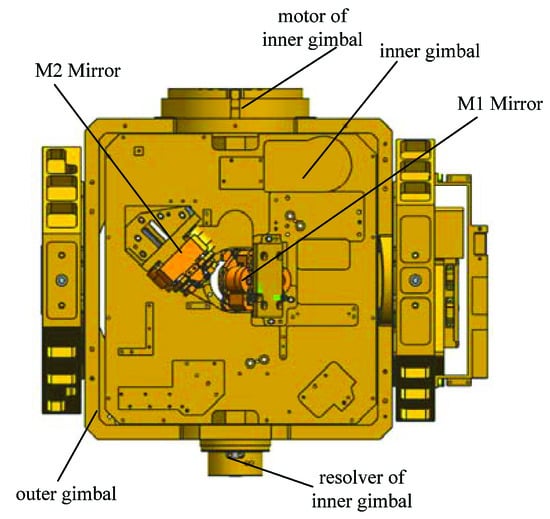 The schematic diagram of the imaging optical path of the system is shown in Figure 3. The beam of the ground target is incident into the detector through M1, M2, M3, and M4 mirrors. The outer gimbal rotates around the pitch axis, and the inner gimbal rotates around the roll axis. Whether the outer or the inner gimbal rotates, it drives the mirror system and detector to rotate synchronously. In the mirror system, the M1 mirror and M2 mirror are rotating mirrors, which respectively compensate for the image motion in roll and pitch directions. M3 and M4 mirrors are fixed mirrors, which mainly realize the internal optical path turning so that the light can be injected into the detector.