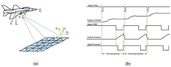 The working principle of the system and timing diagram is shown in Figure 2. Based on the position information of the ground target, the command and algorithm unit calculates the respective two-axis gimbaled command angle. The gimbaled controller drives the gimbal to step to the corresponding angle before exposure and keeps the inertial space position stable during the exposure. The mirror system is used to compensate for the image movement caused by the speed, attitude movement of the plane, and the gimbal; the detector collects imagery. After one exposure, the command and algorithm unit gives the next gimbaled command angle according to the geospatial position and overlap ratio. The gimbal system and the mirror system repeat the tasks in the previous frame process. Repeatedly, the images at each location are then stitched together to form a large but high-resolution mosaic image [14].