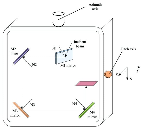 Mirror coordinate frame: all the mirrors are mounted on the inner gimbal. M1 mirror is a roll mirror and rotates about the x-axis. When its angle is zero, its normal vector is tilted 45° with the x-axis of the gimbal. M2 mirror is a pitch mirror and rotates about the z-axis. When its angle is zero, its normal vector is tilted through 45° with the y-axis of the gimbal. M3 and M4 mirrors are fixed mirrors. Their normal vector is respectively tilted through −45° and −135° with the z-axis of the gimbal. This coordinate frame is denoted by the symbol M [15,16].