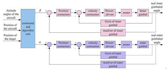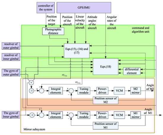 From the above equations, it can be known the angular rate that the M1 mirror required to rotate is consistent with the value sensed by the gyro of the inner gimbal. So it can be obtained directly by collecting the value of the inner gimbal gyro. However, the angular rate of the M2 mirror is related to several parameters, including the current angle of the M1 mirror, the angles and angular rates of the inner and outer gimbals, and the angular rates of the aircraft. If a gyro can be installed on the z-axis of the M1 mirror, the rate sensed by this gyro can be used as the compensation parameter of the M2 mirror. However, because of limiting installation space, the axis cannot be installed with a gyro. Considering the parameters required by the M2 mirror are only used as the inputs of the system, and its control feedback uses a special position sensor, so the requirements for the acquisition bandwidth of the above parameters are not high. And therefore, the sensors installed on the gimbals, M1 mirror and the aircraft can be used, then the compensated parameters can be obtained by calculation. The block diagram of the system is shown in Figure 6.