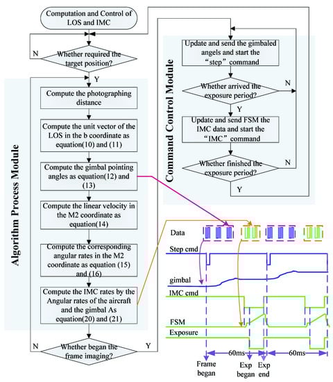The imaging time of each frame is 60ms.After receiving the target position information, the command and algorithm unit starts to calculate the working parameters required by the gimbal and FSMs. According to the method described in Section 3.3, the gimbaled command angles are calculated in real-time based on information such as the position of the target point and the aircraft, the attitude of the aircraft. Similarly, as described in Section 3.4, the velocities of image motion compensation are calculated. After the frame cycle starts, the gimbaled command angle required by the current target position is updated in real time and sent to the gimbal subsystem, and the “step” command is started at the same time. Then the gimbal is controlled to move to the position indicated by the command angle. To reserve start time for FSMs, the command and algorithm unit send image motion compensation (IMC) command before exposure. During the exposure, the gimbal subsystem keeps the LOS stable, and FSMs compensate according to the real-time velocities. After the exposure is completed, the command and algorithm unit starts to send the gimbaled command angles of the next frame, which is repeated to achieve high-precision positioning and high-resolution imaging. The control flow chart is shown in Figure 7.