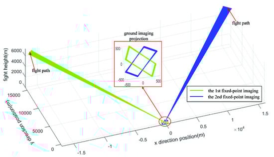 Aircraft flight path and ground imaging projection when the system performs fixed-point imaging in two different directions.
