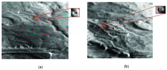 In the fixed-point mode, the coordinate of the target is fixed and is located in (0,0,0). With the aircraft flying, the gimbaled command angles and velocities of IMC are calculated in real time. The gimbal subsystem adjusts the pointing angles to keep the LOS point to the fixed target. At the same time, according to the flight information of the aircraft, the actual gimbaled angles and the position of the compensation mirrors, the LOS and the corresponding ground target coordinates can be calculated reversely. And the position deviation between the planned imaging target and the actual target point can be obtained. Figure 8 shows the data that the system performs fixed-point imaging in two different directions. Although the position of the aircraft changes greatly, LOS always points to the fixed target and images the target from all angles. Due to the measurement errors of various sensors, the errors of the control system and other reasons, there will be position deviations in the imaging projection area on the ground. The position deviation of roll and pitch directions are within 15 m, as shown in Figure 9. In the exposure process, FSMs adjust the position in real time according to the given speeds to keep the image clear. Figure 10 is photographed images of the two fixed-point imaging in the mid wave infrared (MWIR) band. The tri-bar can be clearly distinguished from the detailed enlarged pictures.