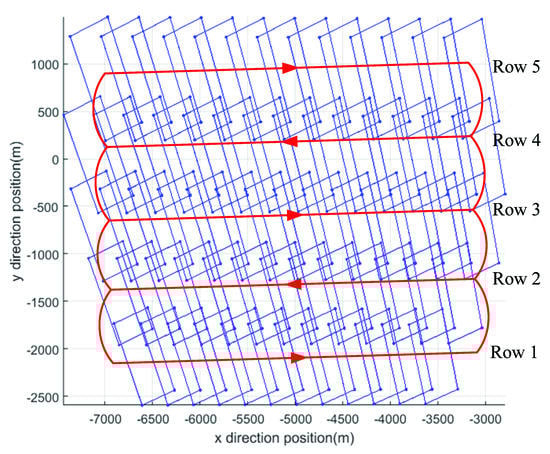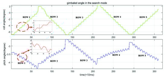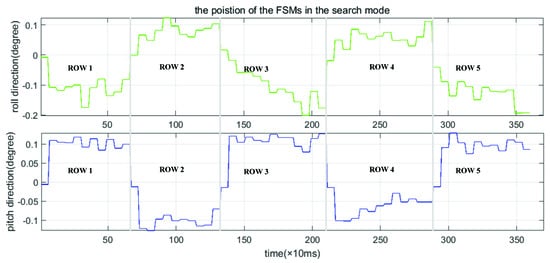 In the search mode, the target coordinates are variable. In the case of ensuring the overlap, different targets are imaged in sequence, to perform search imaging on an area. The command and algorithm unit calculates the gimbaled command angles of the current target and sends it to the gimbal subsystem before exposure. The position of the target is always maintained during the exposure, and it switches to the command angles of the next target after the exposure is completed. To improve efficiency, the system step and start back and forth. The first row is from left to right, the second one is the opposite. The roll gimbaled angle changes greatly with each frame step, while pitch gimbaled angle changes greatly with each row step. Figure 11 is the ground imaging projection map in search mode. It can be seen that it can achieve the coverage imaging of the area and meet the overlapping requirements. The real-time changes of the gimbaled angles are shown in Figure 12. During each frame, the gimbaled angles approach gradually the command angles and keep stable until the next command angles are received. Figure 13 shows the positions of the FSMs at the exposure time in the search process. Since the step direction is opposite after each row, the compensation direction of the next row is reversed.
