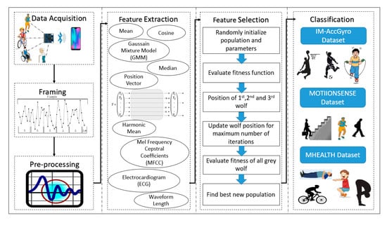 The complete framework for human activity recognition using wearable inertial sensors is depicted in Figure 1. Data are first collected by inertial sensors attached at the wrist, the knee, and the back of the participants. The collected data are preprocessed using a band-stop filter. Fourteen different features are extracted from the filtered data. Subsequently, the extracted features are optimized using BGWO. Finally, the optimized features are fed to a DT classifier to obtain the final classification. A detailed description of the system is given in the following section.