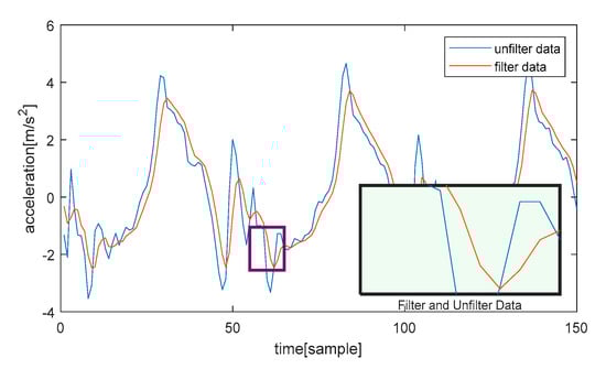 Initially, signal enhancement is applied to the inertial sensor data to eliminate redundancy, irrelevancy, and inconsistency in the framed data. The band stop notch filter [] is used for signal representation to improve the quality of data. A second-order band stop (notch) filter has two cut-off frequencies, lower cut-off and upper cut-off, which are applied to the framed data. Such a filter passes all frequencies from zero to both cutoff frequencies. All the frequencies between the lower cutoff and the upper cutoff are rejected. The bandwidth of the notch-filter is calculated by subtracting the lower cut-off frequency from the higher cut-off frequency, as shown in Figure 2. The filtered data and unfiltered data of the accelerometer signal are plotted on the same axis. The red signal represents the filtered data and the blue signal represents the unfiltered data. Moreover, an on-figure magnifier is added on the plotted accelerometer data showing the zoom-in area of the graph.