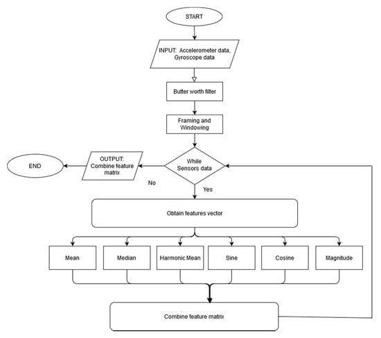 After framing and preprocessing the data, fourteen different features are extracted in each frame, including statistical features, Mel Frequency Cepstral Coefficients (MFCC) features, ECG features, and GMM features. The statistical features are computationally less intensive and can be easily extracted in real time [,,]. The statistical features applied in this paper are the mean, median, harmonic mean, position vector, sine, and cosine. The MFCC features represent the frequency and amplitude of the sensor signals and are individually helpful in finding the pattern of each activity. The ECG features are commonly used to find the absolute pattern of a signal. In this paper, the ECG features include the autoregressive, waveform length, slope sign change, and Willison amplitude, which can efficiently detect the specific pattern of each activity. Furthermore, the GMM features include the weighting ratio, mean, and covariance for activity recognition. Figure 3 defines the flowchart of feature combinations as: