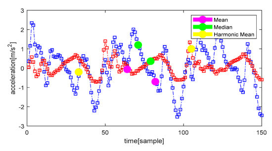 where fn is the total number of samples in each frame and fi corresponds to the current sample of the signal and ranges from fi to fi+N. Figure 4 represents the overall 1D plot of the means, medians, and harmonic means. The blue signal and red signal represent the sitting down and standing up data taken from the accelerometer. Moreover, purple dots, green dots, and yellow dots on accelerometer signals represent mean, median, and harmonic mean value, respectively.