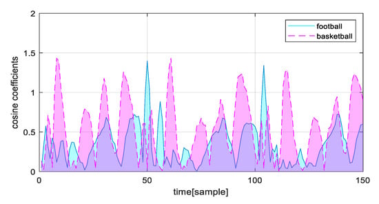 Cosine coefficients of football and basketball activities. The cosine coefficients of the football and basketball activities signal are depicted by blue and purple signals.