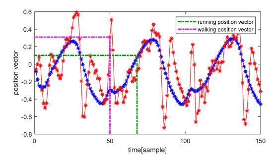 where fi, fi+1, and fi+2 represent the current three samples of the sensor signal, as shown in Figure 6. The running and walking activities are represented by a red signal and a blue signal. The position vector of the running activity is represented with a purple dotted line and the position vector of the walking activity is represented with a green dotted line. The purple and green dots are further extended along the x-axis and y-axis to represent them more precisely.