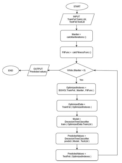 In this paper, three basic classifiers, along with optimization algorithms, were used to evaluate the proposed preprocessing and feature extraction methodology. These are the Decision Tree classifier optimized by BGWO, the SVM optimized by particle PSO, and the Genetic Algorithm optimized by ACO. Figure 7 defines the flowchart of feature optimization and classification.