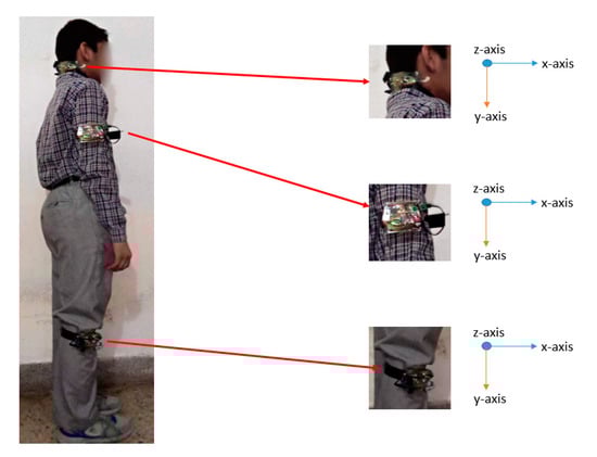 The IM-AccGyro dataset [] is our self-annotated human–machine interactive dataset. Three accelerometer sensors were attached at three different locations, which were the arm, leg, and neck of the subject, as shown in Figure 10. The ages of the participants ranged from 15 to 30 years. Six different indoor and outdoor physical exercise activities were performed including boxing, walking, running, sitting-down, standing-up, and clapping.