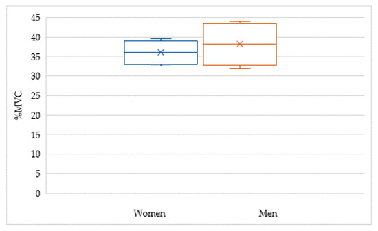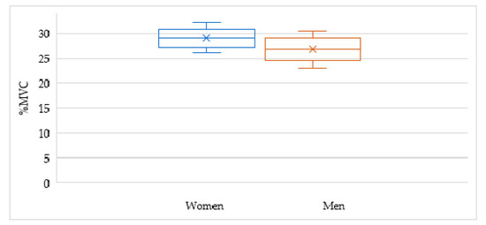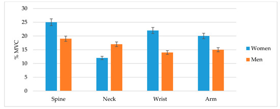 The maximum mass of the unit muscle load (points where the green line contacts the red and bluelines) for women was 5.2 kg, while for men it was 7.0 kg, including similar working conditions. The lowest load was in the neck. The peak was recorded in the spine and ranged from 19% to 25% MVC, respectively. The lowest figure was in women’s necks, 11% MVC, and for men’s wrists, 14% MVC. Figure 6 shows the standard deviation for the given value.