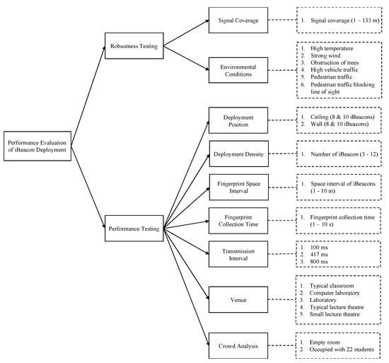 In order to evaluate the performance of iBeacon positioning under different environments and deployment settings, two sets of testing were conducted in this study, namely, robustness testing and performance testing, with the overall framework shown in Figure 1. Robustness testing focuses on the effects of distance and environmental factors (e.g., temperature, wind, trees, vehicle traffic, pedestrian traffic with and without blocking line of sight) on the stability of the iBeacon signals in outdoor environment. The details of the setup are described in Section 4. Performance testing focuses on the effects of various deployment plans and environmental factors on indoor positioning accuracy, including the iBeacon deployment position, deployment density, fingerprint space interval, fingerprint collection time, transmission interval, influence of venue and the crowd analysis. The details of the tests can be found in Section 5.