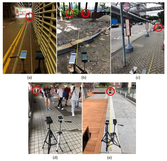 To ensure the stability of iBeacon signals, the tests started after the iBeacons were deployed for at least two hours under each environmental condition. For experimental conditions (a)–(e), the signals were measured from distances 1 m to 20 m at 1 m intervals for 1 minute. For experimental condition (f), the signals were measured from distances 2 m to 20 m with same interval and duration as (a)–(e). The signal data collected were compared with the control data collected in a typical outdoor environment with fewer environmental factors, as shown in Figure 2e (i.e., air temperature at 28 °C and iBeacons installed under the shadow of a tree crown with an internal temperature of 34 °C, wind speed of 3.3 m/s recorded by nearby weather station and no pedestrian and vehicle in the experimental environment).