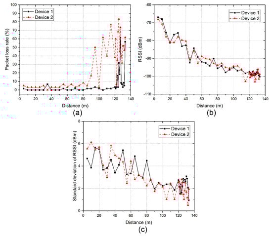 Analysis of maximum coverage test on (a) signal packet loss rate, (b) received received signal strength indicator (RSSI) and (c) standard deviation of RSSI.