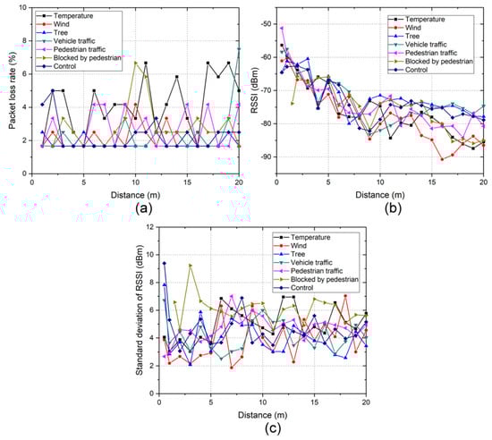 Analysis of environmental conditions test on (a) signal packet loss rate, (b) received RSSI and (c) standard deviation of RSSI.