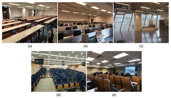 Experimental environments. (a) Typical classroom (Room ZB214). (b) Computer laboratory (Room ZS1010). (c) Laboratory (Room V721). (d) Typical lecture theatre (Room Z205). (e) Small lecture theatre (Room Z414).