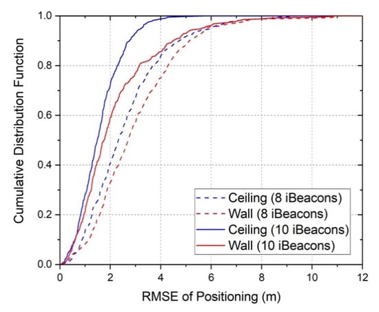 The results of deploying iBeacons to the ceiling or wall with 8 or 10 iBeacons, respectively, are presented in Figure 7. As shown in Figure 7, the positioning accuracies from the ceiling and wall deployment schemes were compared with the cumulative distribution function (CDF). From Figure 7, we observed a lower error rate when 8 iBeacons were deployed on the ceiling compared with being deployed on the wall, and the superior accuracy of the ceiling deployment scheme with 10 iBeacons echoed the results obtained with 8 iBeacons. The root-mean-square error (RMSE) for the ceiling deployment was also lower than that of the wall placement method for the deployments of both 8 and 10 iBeacons.