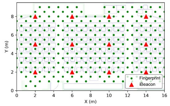 The deployment of iBeacons is challenging work, which can be affected by numerous factors, e.g., the number of iBeacons, spacing between iBeacons, interference with electronic devices, algorithms used for positioning and environmental conditions. Despite the amount of research on the accuracy of indoor positioning, the literature has only focused on limited aspects of the deployment, such as placement or TX power, approaching issues from the point of view of an approximate function or general solution to a problem. While some educational institutions have used iBeacons in physical learning spaces for teaching and learning purposes [], for example, attendance monitoring [,], dissemination of electronic teaching material and information [,], combining augmented reality contents [,] and for smart facility management purposes [,], there is no research paper that has conducted a comprehensive study to analyse the various environmental factors and deployment factors on iBeacon positioning accuracy for physical learning spaces. For the sustainable deployment of iBeacons in the future, therefore, this paper aims to: (a) evaluate the influences of different environmental factors to iBeacon signals with a series of robustness testing, and (b) evaluate the performance of different deployment settings of iBeacon, i.e., deployment position, deployment density, space interval of fingerprint method, collection time interval of fingerprint method, iBeacon signal transmission interval, venue and crowd condition, with a series of performance testing under the same control environment.