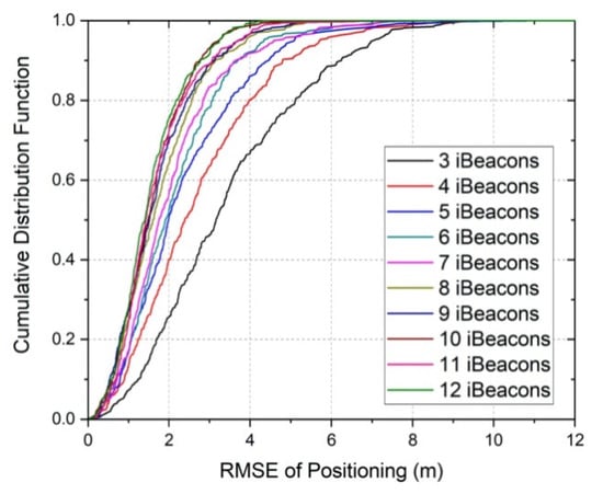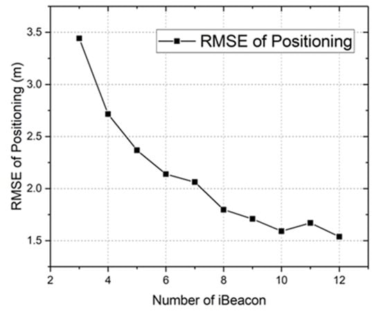 Using more iBeacons can result in greater coverage, with the following caveats. Deployment density can be increased by walls, furniture, distance and other obstacles, as they could attenuate the signals. With the deployment of different numbers of iBeacons, ranging from 12 to 3 iBeacons in this test, the CDF of RMSEs were plotted in Figure 9. The results show that positioning accuracy was enhanced by increasing the number of iBeacons from 3 to 12 (Figure 9). The RMSE was highest with three iBeacons and diminished gradually until eight iBeacons were deployed. The CDFs of the RMSE in using more than eight iBeacons were very similar in Figure 9. Figure 10 presents the difference in RMSE using different numbers of iBeacons. The results indicate that there was a significant improvement in accuracy from 3.44 m to 1.80 m, when the number of iBeacons was increased from three to eight. Using more than eight iBeacons resulted in a minimal increase in accuracy. The improvement of RMSE from 8 iBeacons to 12 iBeacons was 0.26 m, which was reduced from 1.80 m to 1.54 m. Dalkilic et al. [] explained that when iBeacons are close to each other (for instance, when there are too many iBeacons), the receiving mobile phones have difficulties detecting the exact location of the signal sources. Our results suggest that having too many iBeacons not only fails to improve the positioning accuracy significantly, but could also result in unnecessary overlaps of coverage areas.