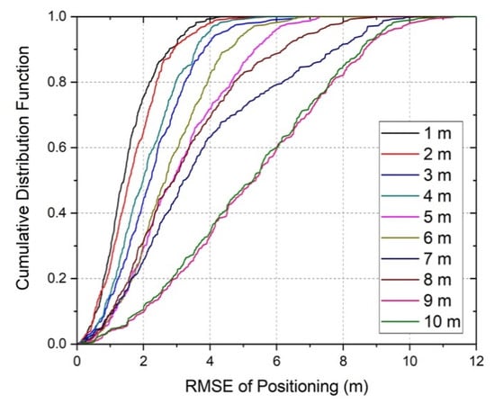 Experimenting with fingerprint grid widths represents an opportunity for those implementing BLE-based systems to save time and manpower. The results of collecting fingerprint at different space intervals with 12 iBeacons installed on the ceiling are shown in Figure 11. The CDF from 9 m and 10 m grids were very similar, having the lowest accuracy, which was over 5 m in overall RMSE. This was the result of a lack of fingerprint collection points in the room, since these two intervals collected signals at one point as database only.