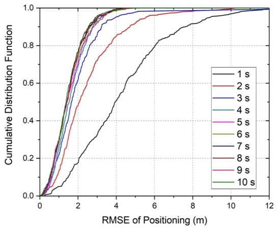 Testing of fingerprint collection time was conducted with the same configuration, using 12 iBeacons installed on ceiling. The CDF comparison of the collection time by RMSE, under different collection times, is shown in Figure 12. As the collection time increased, the RMSE of positioning accuracy decreased. The RMSE decreased substantially from a collection time of 1 s to 3 s, suggesting that very short collection times cause large uncertainties in positioning. There was a significant reduction in variance at a collection time of 4 s, and similar positioning errors were found in collection time of 4 s to 10 s. Although improvements were observed in the error rate with every additional second of collection time, improvements in RMSE from 6 s to 10 s were extremely marginal, with a drop from 1.53 m to 1.49 m.