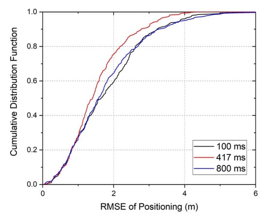 As the increase of the transmission interval reduces the power consumption of iBeacons, we aimed to locate a balance between accuracy and power consumption. Thus, the experiment was conducted in the same room (ZB214) with 12 iBeacons. The hypothesis in this test was that reducing the transmission interval would improve the positioning accuracy, due to a greater number of Bluetooth signals in a fixed period of time. We expected that a short transmission interval (i.e., 100 ms) would have better performance than long transmission intervals (i.e., 417 ms and 800 ms) because of the high number of signal packets. Yet, the CDF of RMSE did not support this hypothesis (Figure 13). The CDF curves of 100 ms and 800 ms interval were very similar, and most of the parts overlapped. The differences between their overall RMSE were only 0.01 m, where the RMSE of 100 ms interval was 1.81 m and the RMSE of 800 ms was 1.80 m. As shown in Figure 13, the interval of 417 ms outperformed significantly and the overall RMSE was only 1.54 m.