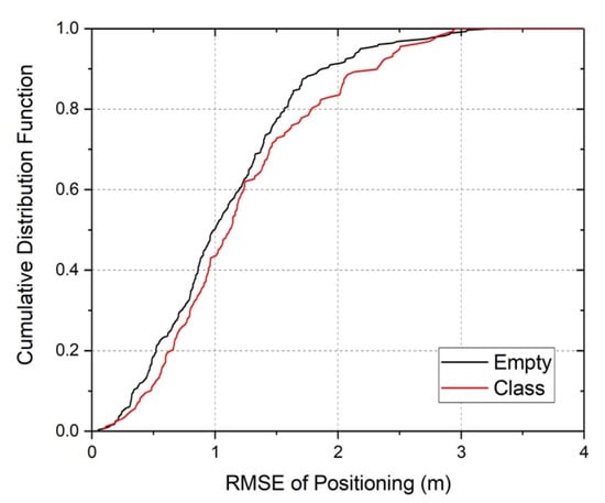 The negative impact of the pedestrian was evaluated in the previous outdoor environmental conditions test, and the results suggest the human body attenuates wireless signals. The influence of a crowd in a room was tested in this experiment by mounting the iBeacons on the ceiling to enhance the line of sight for better signal transmission. Figure 14 compares the CDF of RMSE results from the classroom with 22 students and the classroom without students. The positioning performance of the empty room was better than that of the occupied classroom. The overall RMSE increased from 1.10 m to 1.23 m, with an increment error rate of 1.17% when the room was occupied with students.