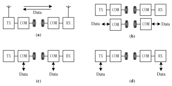 Diagram of four basic methods for bidirectional communication. (a) Radio frequency link. (b) Additional communication coils. (c) Coupling with compensation circuit. (d) Modulating with power converter.