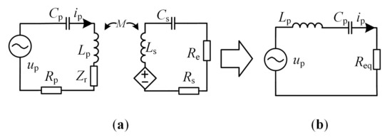 where , and the equivalent resistance seen from secondary side is . If the WPT system works in the resonant state, the reflection impedance has pure resistive characteristic. To analyze the simplified second-order circuit shown in Figure 4b, the equivalent impedance is derived as
