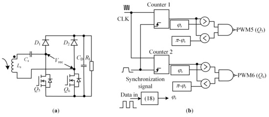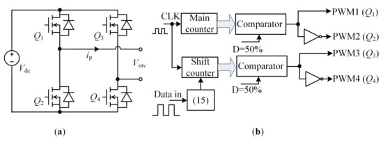 On the primary side, a full-bridge inverter that works in phase-shifting mode is employed to regulate input power for resonant tank, as shown in Figure 5a. The output voltage and output current are defined as and , respectively. In terms of the modulator, as shown in Figure 5b, the main counter and the shift counter are used to generate digital count values, and they share a same clock source (CLK). Comparing the value of the two counters with the half count value will generate a square wave signal with 50% duty cycle. Unlike the main counter, the initial value of the shift counter is determined by the transmitted data shown in (15). Finally, the obtained four signals () are used to drive the four MOSFETs (), respectively. The output voltage of full-bridge inverter with Fourier series form is expressed as