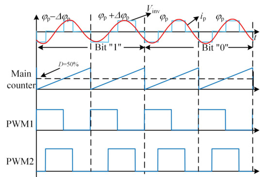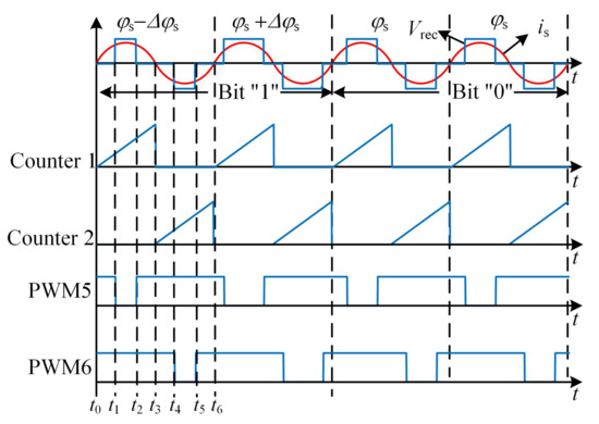 When bit “0” is sent, the phase-shifting angle maintains its initial value for two switching cycles. When bit “1” is sent, the phase-shifting angle is set to in the first switching cycle, and then becomes in the next switching cycle. Since the change of phase-shifting angle is differential and complementary, the modulation method is defined as differential phase shifting keying (DPSK).