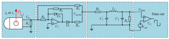 The data demodulation is dependent on the envelope characteristics of the primary and secondary side currents, therefore, the demodulators on both sides can be designed with a similar structure. According to the functionality, the demodulator circuit shown in Figure 10 can be divided into four parts: current to voltage () converter, precision full-wave rectifier, passive third-order low-pass filter and comparator. For the converter, its input voltage is determined by the ratio of high-frequency current sensor and the value of , and the transconduction gain can be expressed as . In practice, the variation of voltage of current sensor is too small, and it is easily overwhelmed by the threshold voltage of diode. Then, the precision full-wave rectifier will compensate this voltage, and the output voltage on rectifier is given by