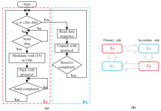 Figure 12a shows the detailed flowchart of half-duplex communication, where “Tx” and “Rx” represent the sending and receiving data modes, respectively. These two modes are determined by the initial current in primary or secondary side. If current fluctuation is detected, “Rx” mode is selected. The transmitted data is unpacked with protocol above then the beginning state occurs until the received bits are completely processed. If there is a command or data protocol to be sent and the initial current is stable, the “Tx” mode is selected. After all bits are packed with protocol and completely sent, the beginning state occurs and waits for the next communication process. The working sequence is shown in Figure 12b, where the “x” and “Rx” modes work in turn on both side, and these two modes can be regarded a cycling communication process.