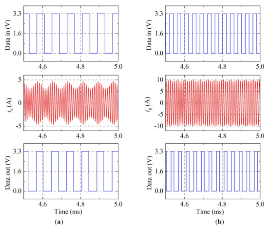 Compared with the forward communication, the transmitted bits of backward communication are the same but the data rate is different, as shown in Figure 14b. Due to the constant current characteristic in the SS compensated circuit, the fluctuation of the primary current is smaller than the secondary current .