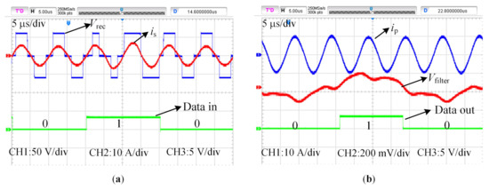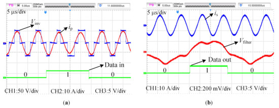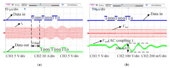 Figure 16a shows the measured output voltage and current of the full-bridge inverter when the transmitted bits (Data in) are “010”. The initial phase-shifting angle and differential phase-shifting angle are set to and , respectively. The variations of and are consistent with the variations in Figure 6. In the forward modulation process, is almost in the phase of , and zero phase angle of inverter is achieved. Figure 16b shows the corresponding waveforms of , and received bits (Data out). The transmitted bits are successfully recovered from the demodulator on the secondary side.