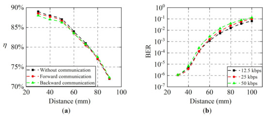 Figure 19a compares the DC to DC efficiencies with and without communication under different coil distance. As the distance increases, gradually decreases but the trends of three different conditions are similar. Because the modulation of backward communication changes the equivalent resistance of load, the system efficiency of backward communication is slightly lower than that of forward communication. Generally, the impact of the communication process on the system efficiency can be negligible. Figure 19b compares the measured bit error rate (BER) under different data rates (50 kbps, 25 kbps and 12.5 kbps) during the forward communication. As the distance increases, the BER under three rates rises significantly. Under the same distance, the BER at lower data rates is relatively small.