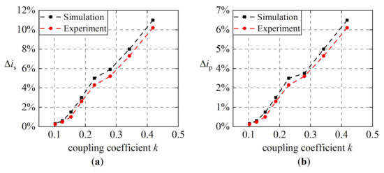 When = , = , and = 20 , the fluctuation of secondary current and primary current are shown in Figure 20a,b, respectively. Due to the constant current characteristic, in the backward communication is smaller than in the forward communication. Because of the nonlinear characteristics of the rectifier and scattering resistance of the coils, there is a small difference between experiment and simulation results, especially when the coupling coefficient is lower than 0.2. The experiment results almost follow the simulation results.