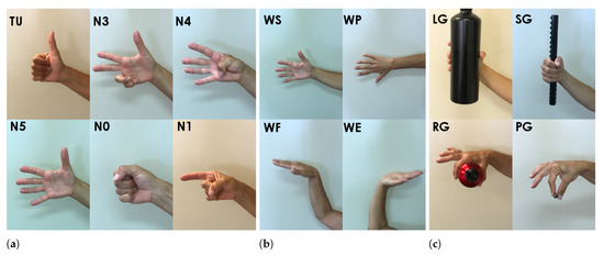 A total of 14 gestures (Figure 1) were selected, and following the protocol reported in [20,41], each volunteer performed six consecutive repetitions of the same hand movement, lasting for about 3 s, followed by an equal epoch of resting. Periods of gesture maintenance and resting were selected by the subjects following the indications reported on a screen placed in front of them during the entire acquisition. Thus, each volunteer performed 84 repetitions, for a total of 252 analyzed signals, partitioned as follows: the first set (set 1, Figure 1a) contained 6 gestures involving finger movements; i.e., thumb up (TU), flexion of ring and little finger and extension of the other fingers (miming number 3, N3), thumb opposing base of little finger (miming number 4, N4), hand opening (miming number 5, N5), fingers flexed in the fist (N0) and pointing index (miming number 1, N1). The second set (set 2, Figure 1b) of gestures involved wrist movements: wrist supination (WS), wrist pronation (WP), wrist flexion (WF) and wrist extension (WE). In the last set (set 3, Figure 1c), the following grasping gestures were considered: large diameter grasping (LG); small diameter grasping (SG, also known as power grasping); ring grasping (RG), wherein a circular object is held by using the thumb and the index finger; and pinch grasping (PG), wherein a small object is grabbed by using the thumb and the index finger.