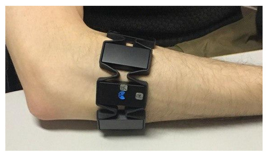 Regarding the former aspect, the most common procedure is choosing a pair of forearm muscles, e.g., the flexor and extensor carpi radialis [16,17], or adding to the former also upper-arm-placed probes [18], with a single-differential electrode configuration or by using multi-channels sEMG arrays [4], which allow one to detect more spatially located muscle characteristics, such as fiber length, conduction velocity or temporal characteristics of single motor units [1,3], by means of the sEMG signal decomposition technique [4]. However, in more recent years, the use of low-cost and off-the-shelf devices gained increasing traction for myoelectric-based hand gesture recognition and prosthesis control. In this field, the Myo armband (Thalmic, Ontario, Canada), despite some obvious technical limitations, e.g., a low sampling rate, represents one of the most popular devices for upper limb sEMG signal acquisition, being affordable, easy to set and use and unobtrusive [2,7,10,11,14,19]. Further, it was also used for publicly available datasets [20] and for myoelectric control of prosthetic hands [11].