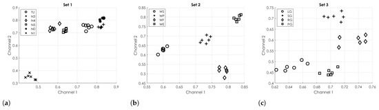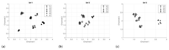 Clustering obtained by using the FEn for the three sets of gestures of a representative subject: set 1 (a), set 2 (b) and set 3 (c). FEn parameters were , and . Channel 1 and 2 indicate the two Myo armband pods used for clustering analysis. On both axes the FEn value relative to each considered channel is reported.